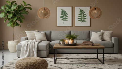 Modern Living Room Interior with Gray Sofa and Botanical Wall Art