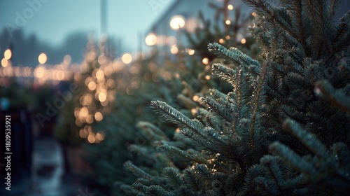 Christmas tree lot with lights, trees, and festive atmosphere.