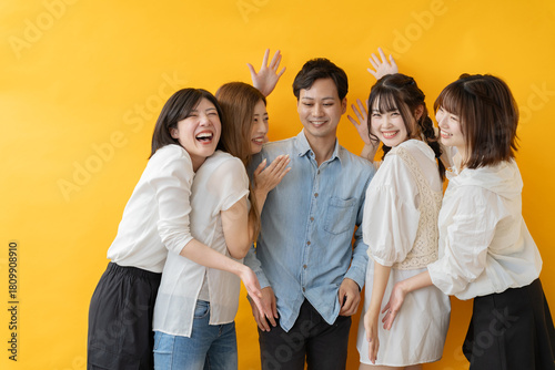 黄色い背景で笑顔ではしゃぐ友人グループ