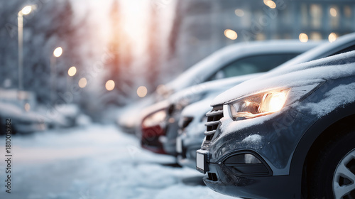 Automobiles covered in precipitation in residential parking area faceless neighborhood scene defocused soft snowy background winter vehicle coverage lot storm seasonal weather