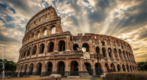 Explore the majestic Colosseum in Rome bathed in golden sunlight under a dramatic sky, perfect for travel, history, and ancient civilization themes
