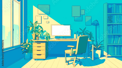 落ち着いた空間でデジタル作業を行う人物のイラスト|在宅ワーク、遠隔授業、PC利用、現代的生活シーンを描いたフリー素材に最適