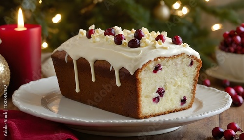 christmas cranberry loaf pound cake with white chocolate chips and cream cheese frosting