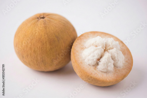 Whole and Cut Santol or Cotton Fruit Showing White Fluffy Pulp Isolated on White
