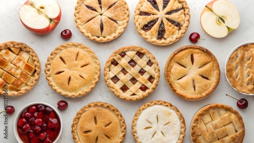 Assorted homemade mini holiday pies arranged in decorative top-view festive baking composition