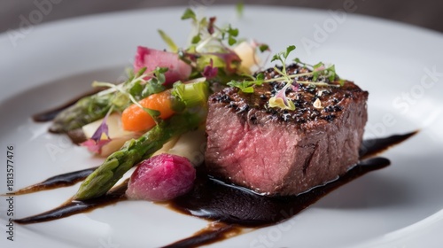 Juicy medium rare steak served with asparagus baby carrots radish and microgreens on a white plate