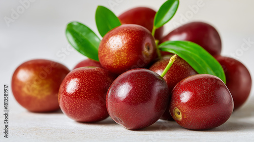 Close-up shot of fresh jujube fruits, shiny red-brown skin, soft diffused lighting, clean minimal background.