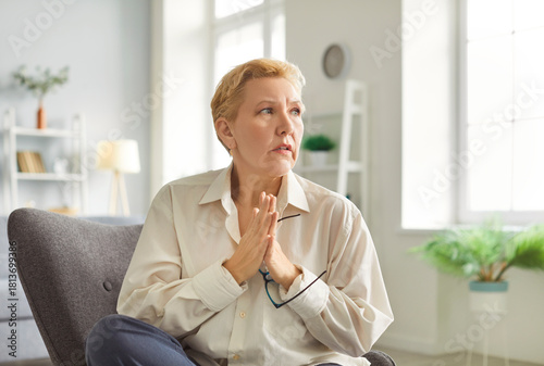 Portrait of thoughtful woman sitting on armchair in cozy room with her hands clasped together. Pensive lady looking to side, appearing deep in thought or reflecting while holding glasses in one hand.
