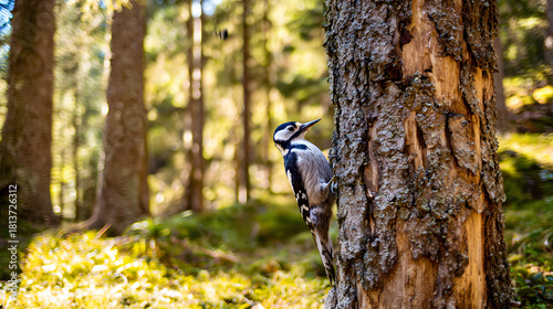 woodpecker. Woodpecker perched on tree trunk captured mid-peck in morning forest light. wildlife magazines, conservation campaigns, designed for eco-tourism storytelling.
