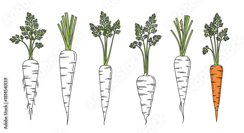 A collection of stylized root vegetables, mostly parsnips and one carrot, with green tops.