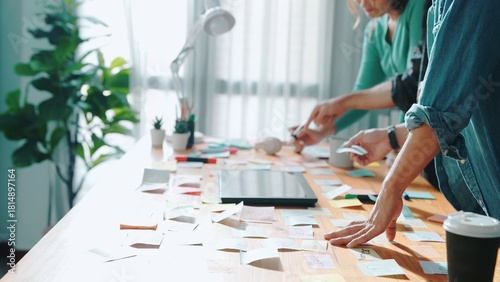 Skilled business team looking at laptop and pointing logo design while making decision to choosing main theme color and planning marketing campaign. Smart start up group working together. Symposium.