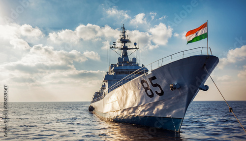 Indian Navy Warship with National Flag at Sea.