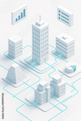 Isometric 3D Smart City Concept Illustration with Floating Data Modules, White Background.
