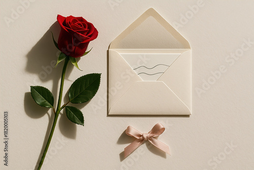 Minimalist Flat Lay with Single Red Velvet Rose, Ribbon, and Open Letter, Romantic Theme.