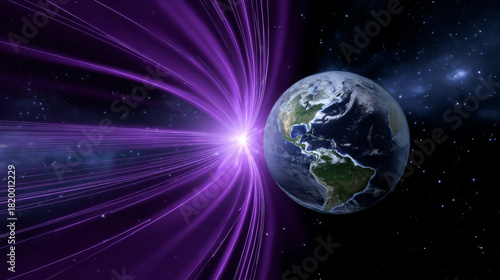 Earth surrounded by vibrant purple energy waves, illustrating cosmic phenomena and the beauty of space, highlighting the connection between planet and universe in a stunning visual representation