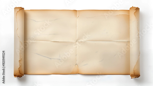 An ancient, cracked parchment scroll partially unrolled on a plain white background, showing yellowed paper with irregular tears and creases.
