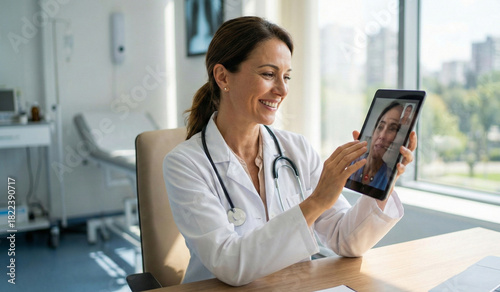 Doctora amable realizando una videollamada con una tablet en un consultorio médico moderno.