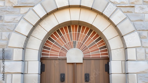 mediocrity. Stone arch doorway with radial brick pattern and central keystone in daylight. real-estate listings.
