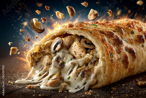 Dynamiczne zbliżenie na chrupiące ciasto wypełnione kawałkami kurczaka, pieczarkami i ciągnącym się serem. Danie wybucha smakiem, w tle płomienie i iskry.