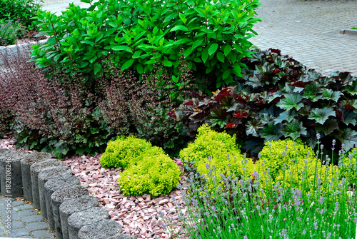 lawenda, waskolistna, berberys, żurawka, krzewuszka, cudowna, na rabacie, murek kamienny, weigela florida, heuchera, berberis, lavandula, angustifolia, betonowy, obwódka, słonecznie, lato, kompozycja