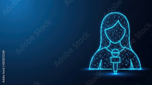 Female reporter with microphone in digital low poly style on blue background