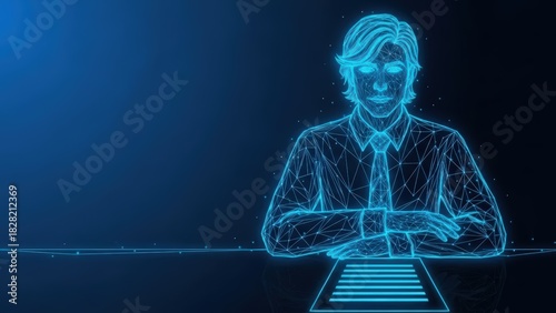 Futuristic digital man in suit with glowing eyes working at a desk