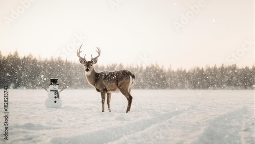 Deer and Snowman in Winter Wonderland - A Serene Encounter.