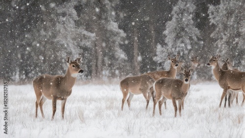 Deer Herd in Winter Snowfall - A Serene Wildlife Scene.