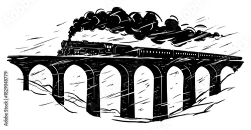 Dynamic black and white steam train crossing a high stone viaduct bridge during a snowy winter journey vector illustration