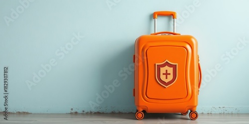 An orange suitcase with a shield and plus sign symbolizes travel insurance and protection against unexpected events du a trip, standing against a blue wall.