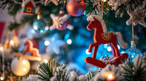 New Year 2026 postcard of the red fire horse. Christmas tree decorations, a red horse, and the numbers 2026 on the Christmas tree. Decorating the interior of your home for the winter holidays.