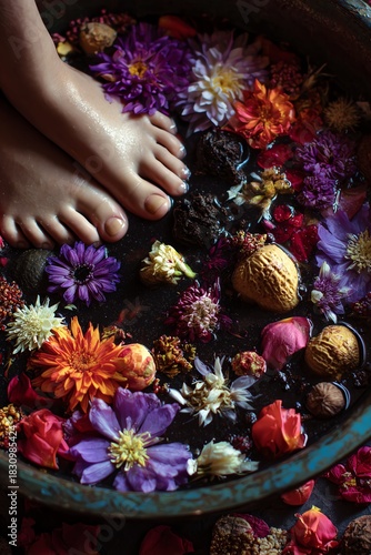 Revitalize your feet with a soothing soak session using natural ingredients for relaxation and rejuvenation.