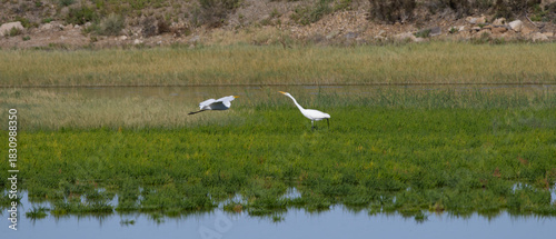At biologically significant wetlands of Bitter Lakes National Wildlife Refuge in New Mexico, in the American Southwest, Great Egrets interact