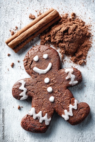 Gingerbread cookie with icing sits on a textured surface beside cinnamon and cocoa powder, evoking a festive spirit
