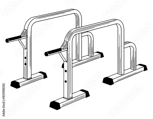 Dip station parallel bars and push up stands hand drawn vector illustration. Black and white calisthenics gym equipment sketch isolated on white background.