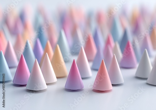 Pastel cone-shaped objects are neatly arranged on a light background, creating an artistic display