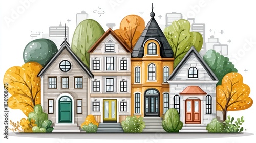 Colorful townhouses stand side by side, surrounded by trees with autumn leaves in a lively neighborhood setting
