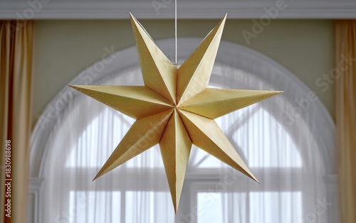 A golden star decoration hangs from the ceiling in a well-lit room adorned with soft curtains