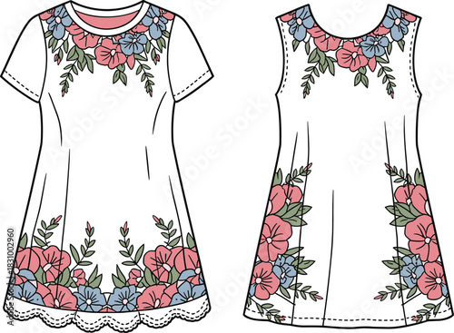 Floral dress illustration, lace and sleeveless styles, fashion sketch, vector template, cad drawing flat vector illustration