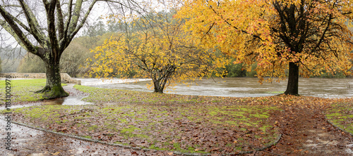 Autumn trees showcasing vibrant yellow foliage alongside a swollen river in a panoramic view