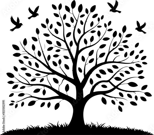 tree with birds flying silhouette vector illustration