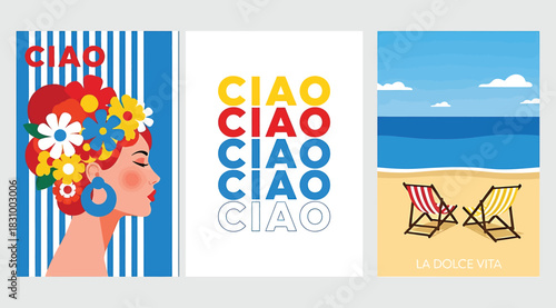 A vibrant collection of three summerthemed posters, each exuding a unique charm a woman adorned with flowers, a playful repetition of ciao, and a serene beach scene with deck chairs