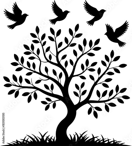 tree with birds flying silhouette vector illustration