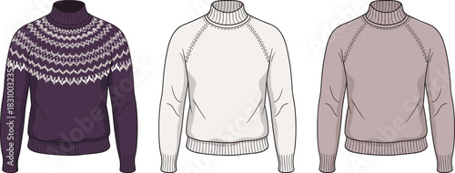 Knitted sweater set sketch, Nordic pattern and ribbed collar detail, three color variations, front view, cad vector illustration