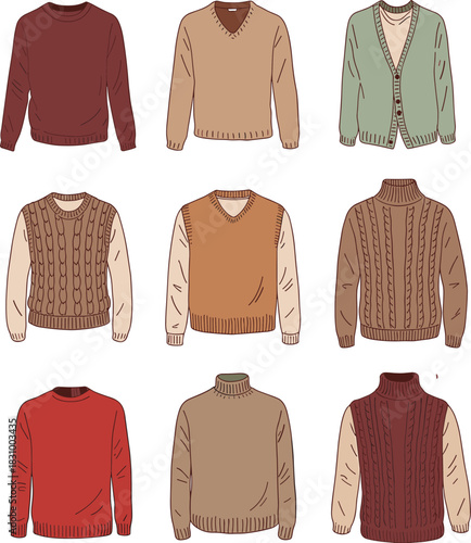 Sweater collection flat fashion illustration, knitwear design vector set, cardigan pullover jumper styles, apparel template for CAD drawing flat vector illustration