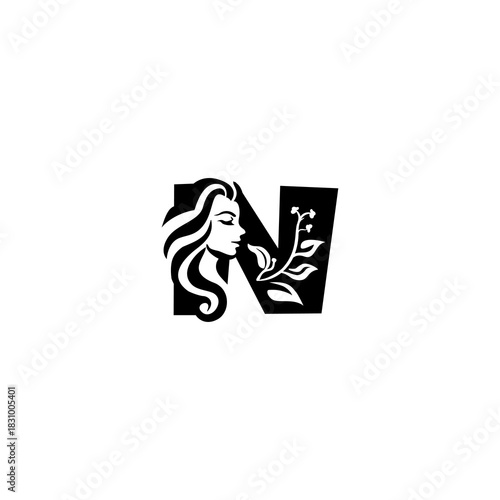 An elegant woman head letter logo featuring flowing hair and leaf elements shaped into an alphabet form, blending beauty and nature in a clean, modern style for branding.