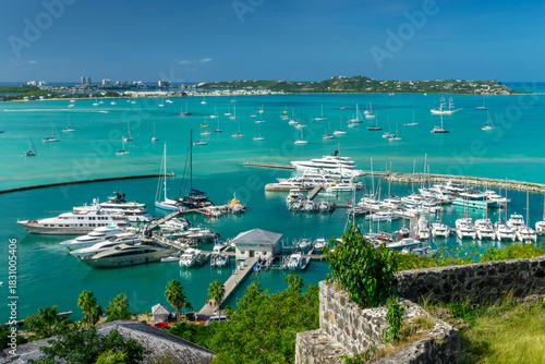 Aerial view of the bay of Marigot with luxury yachts and boats in the harbor, Caribbean island of Saint Martin (Sint Maarten), French West Indies