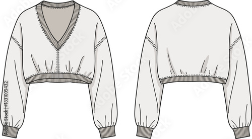 Cropped long-sleeve top sketch, ruched waist and deep V-neckline detail, front and back view, cad vector illustration