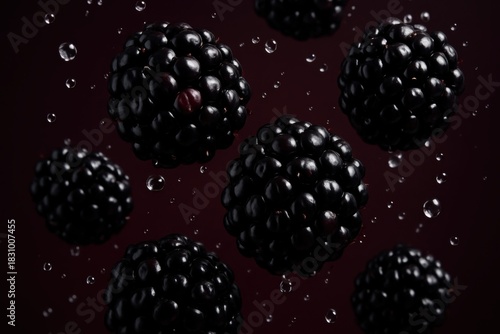 Blackberry Burst: An inviting close-up showcases a collection of plump, juicy blackberries, glistening with refreshing droplets against a dark, moody backdrop, ideal for promoting health, wellness.
