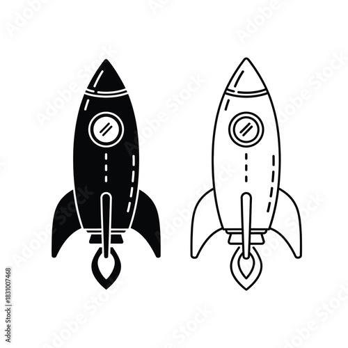 Two rocket ship icons, one black silhouette and one outline drawing, isolated on a white background.